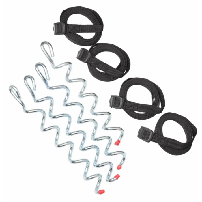 The anchoring set consists out of four galvanized anchors with fastening straps that ensure that your trampoline remains on the ground. The anchors are easy to put in the ground. The straps are attached to the frame and tensioned to the ground anchor. Of course, you can never completely prevent a trampoline from being blown over during a storm, but an anchor set greatly reduces the chance of damage.
