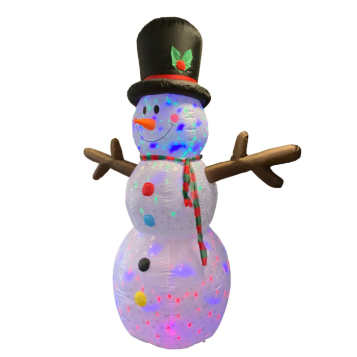 This inflatable Christmas figure Snowman with lighting is perfect for the holiday season. The snowman stands at 2.4 meters tall and is 1 meter wide. Suitable for both indoor and outdoor use. The snowman is easy to set up, inflating and deflating within seconds. It comes with ground anchors and a tension strap for stability. Inside the snowman, some sandbags are incorporated for added strength. Also, additional weight can be placed inside through the zipper at the back of the figure.