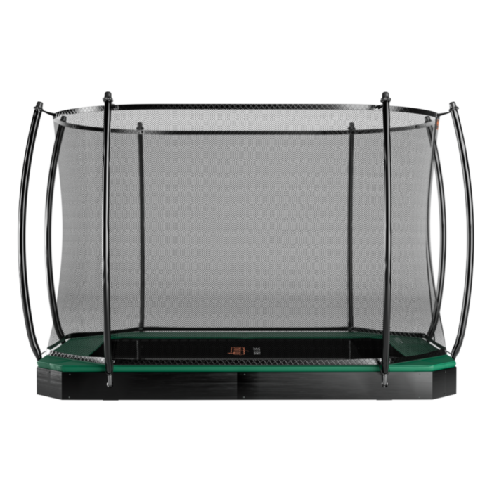This FlatLevel trampoline is made of the best materials and is eqquipped with a green safety pad, double galvanized springs, a flexible jumping mat for optimal jump comfort and a black safety net. The jumping mat has an open structure which makes you jump higher and better. Our FlatLevel trampolines are best sellers and very populair nowadays. The FlatLevel trampoline will be completely buried into the ground, in comparison with our InGround trampolines (20 cm above the ground).