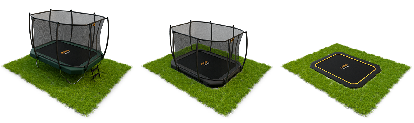 - FlatLevel trampolines: deze graaf je volledig in en zijn dus precies gelijk met het maaiveld. FlatLevel trampolines hebben een strakke uitstraling en worden echt een onderdeel van je tuin.