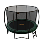 Met een diameter van 430 cm is dit de grootste ronde trampoline in ons assortiment. Heb je een grote tuin, of wil je simpelweg gewoon een grote trampoline? Dan is deze trampoline van 4,30 meter perfect!  De trampoline is voorzien van dubbel gegalvaniseerde veren, een soepele springmat en een stevig groen randkussen.